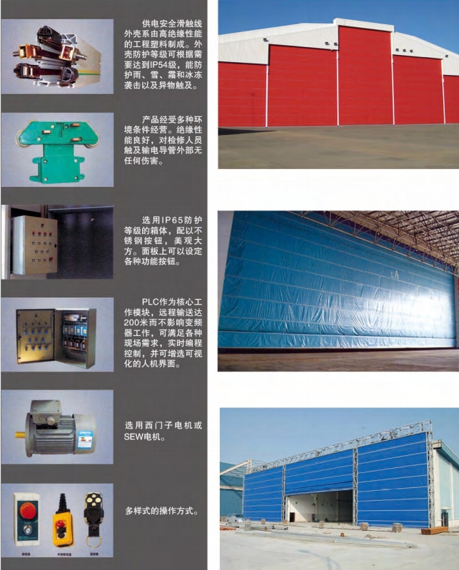 此種形式大門具有占地面積小(不需門庫(kù))、重量輕、無(wú)地軌、結(jié)構(gòu)新穎、抗風(fēng)荷、隔音、保溫等特點(diǎn)、提升速度6-18米/分。